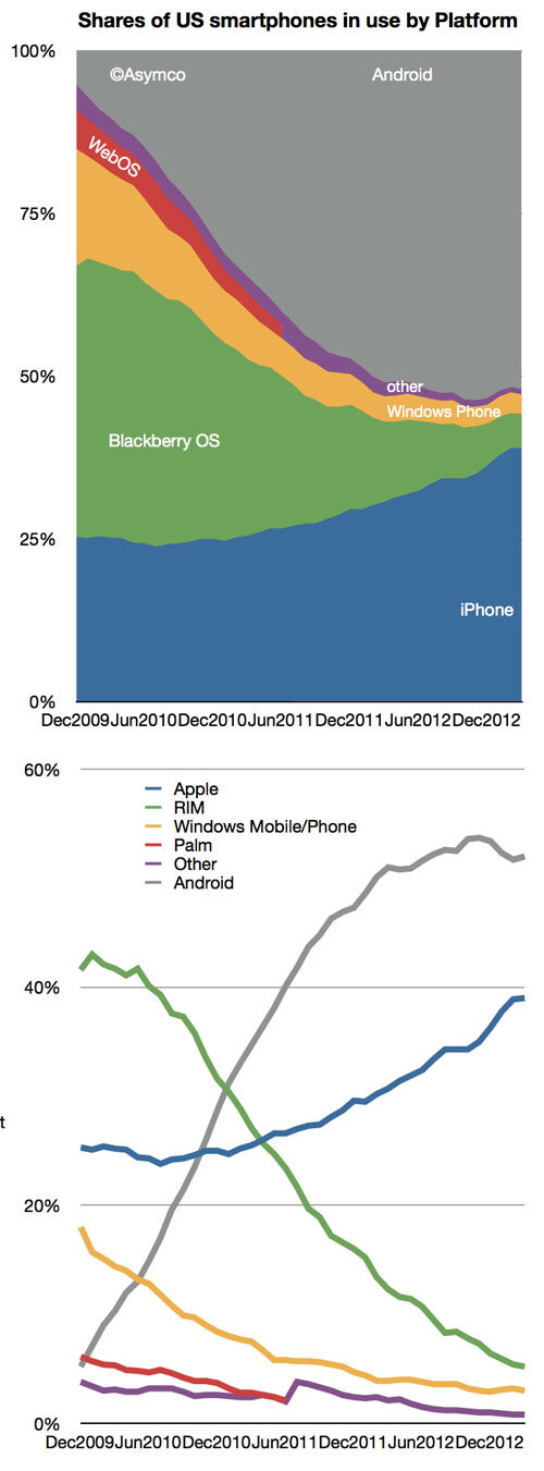 Vemos claramente que, a pesar del aumento contínuo de Android, Apple también ha seguido la misma tónica, aunque a un ritmo menor, pero este último dato refleja que aún no está todo dicho. No pueden decir lo mismo las demás, y menos BB, que ha visto reducida su cuota a cifras ridículas frente a los 2 de cabeza, y ahora está en plena batalla con WP para colocarse en 3ª posición.