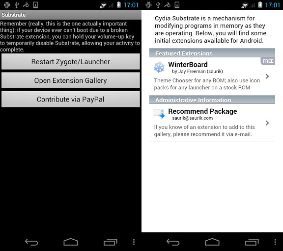 Por tanto, no es un programa que en principio «necesite» estar en Android, pero la verdad es que las restricciones que ponen los fabricantes y las operadoras tampoco se quedan cortas. Por eso se acaba de anunciar la disponibilidad para desarrolladores de Cydia Substrate, una plataforma de desarrollo de código abierto que permite modificar aplicaciones y el sistema sin necesidad de cambiar de ROM. Para conseguirlo, se utilizan unas «extensiones», código que se empaquetará aparte de la aplicación en cuestión y que contendrá las nuevas características que queramos.
