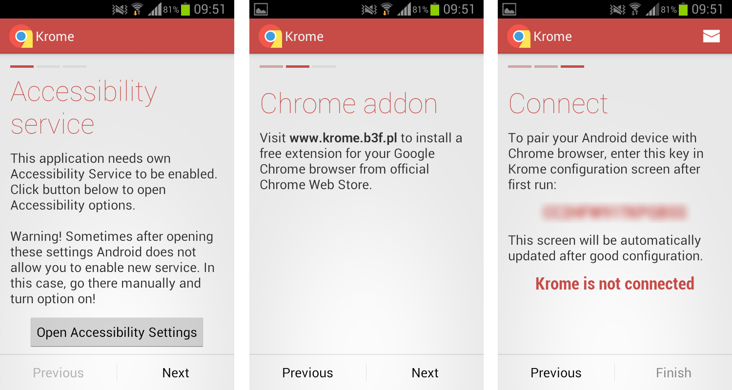 • Seguimos, al abrir Krome por primera vez nos avisará de que necesita tener acceso a los Servicios de Accesibilidad del teléfono para poder leer las notificaciones del terminal, se lo damos entrando en el correspondiente menú de ajustes y listo. Acto seguido nos devuelve una clave alfanumérica que deberemos introducir en la extensión de Chrome y que permitirá que la aplicación se empareje con el navegador. Hecho esto, ya está todo listo.