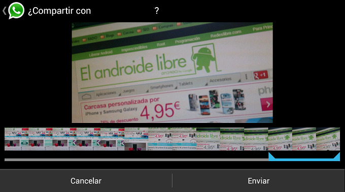En esta nueva actualización, se incluyen correcciones de errores y mejoras al compartir nuestra ubicación, aunque la gran novedad viene de la mano de un nuevo «editor de vídeo», y lo pongo entre comillas porque sólo permite editar la duración del vídeo. Así, justo antes de compartir el vídeo tenemos la opción de recortar el clip y para ello nos muestra la serie de fotogramas que lo componen y sólo hay que marcar el inicio y el fin.