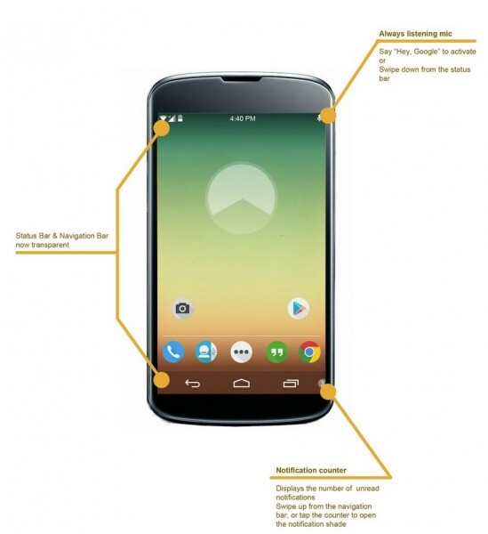 En esta primera captura vemos sobre todo, dos sencillos pero geniales cambios: La barra de notificaciones y la barra donde se integran los botones de Android: Volver, Home y Menú, son ahora transparentes y no negro sólido. Ganamos espacio visual y la sensación de más limpieza en la interfaz sin romper nada del UI de Android. En la esquina superior derecha, tenemos un icono de micrófono, donde se alojaría la búsqueda de Google en lugar del dichoso cuadro que ahora se inserta en la parte superior (en android puro). El micrófono sería tanto como para activar la búsqueda, vocal como escrita como según propone el autor, porque los Nexus pasarían a tener la función de Moto X de la escucha siempre activada gracias a un co-procesador de bajo consumo.