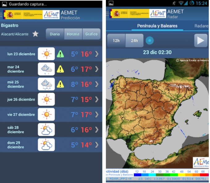 La aplicación de AEMET es gratuita, aunque todavía tiene mucho que mejorar, el rendimiento no es el mejor, me ha dado algunos cierres forzosos y se queda congelada en algunas ocasiones. Es compatible desde Android 2.3.3.