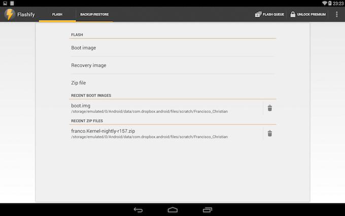 La app también permite flashear desde cualquier aplicación con acceso a los archivos, ya sea root explorer o similares. Sin embargo, cuando salió hace meses los dispositivos compatibles solo eran unos pocos, básicamente los Nexus más nuevos. Pero el autor ha seguido trabajando y con la versión actual se han añadido nuevas e importantes mejoras.