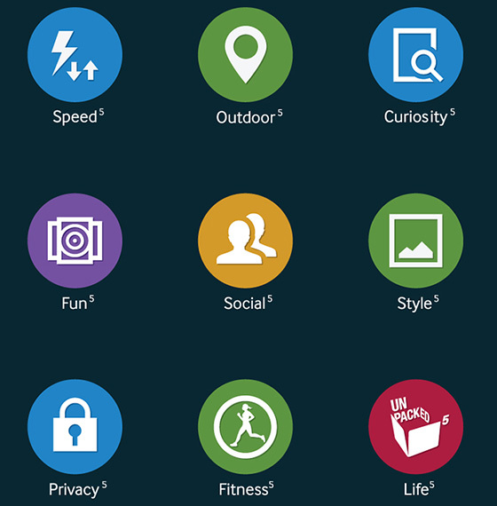 Como se puede apreciar en la imagen, los iconos representarían las nuevas aplicaciones y funciones que incluirá el Galaxy S5 y éstos tienen ahora un diseño circular y estética flat, con colores planos, mucho más minimalistas que los actuales. Se puede leer Speed, Outdoor, Curiosity, Fun, Social, Style, Privacy, Fitness and Life, todas las nuevas aplicaciones para las que el S5 estaría preparado, y parece evidente que estará listo para monitorizar la actividad diaria y el ejercicio físico, así como nuevas herramientas que aumenten la privacidad, diversión, velocidad (¿quizá un modo de alto rendimiento?) y muchas otras.