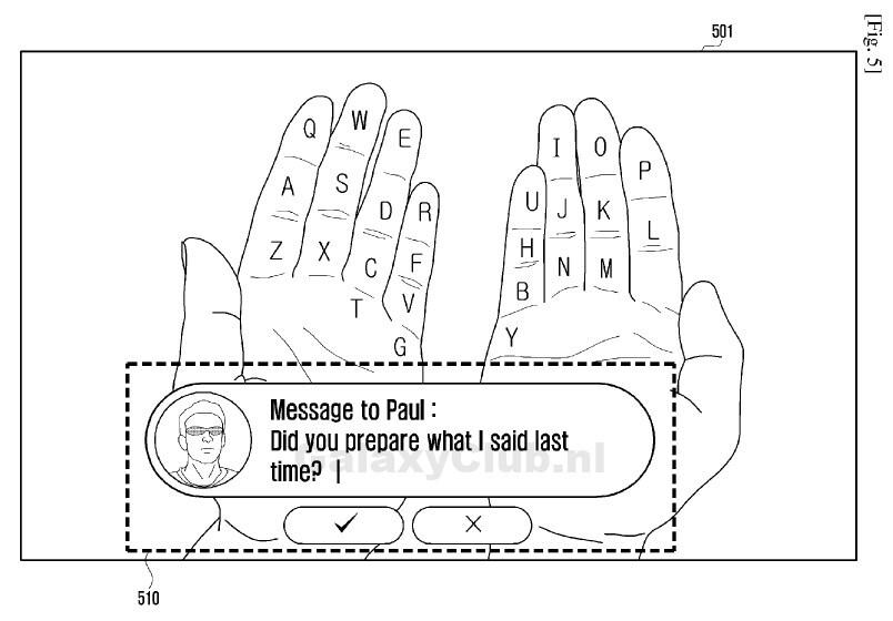 Parece que el proyecto se está materializando, porque ahora nos ha llegado la patente de la interfaz que Samsung estaría planeando implementar en este dispositivo. Si observamos las imágenes veremos como el concepto se basa en proyectar un teclado virtual sobre las palmas de nuestras manos.