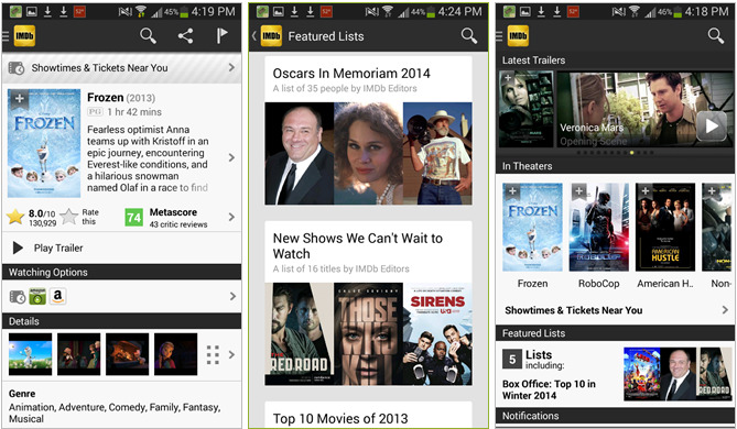 La versión 4.2 de IMDb sigue ahora las pautas de diseño de Android, con un menú de navegación para el contenido y colores más planos, que dejan de lado los clásicos y anticuados degradados. Se añade una nueva sección que trae las últimas noticias sobre premios y eventos del mundillo.