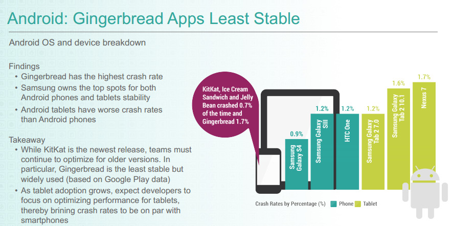Dentro de Android, la versión del sistema que más fallos y cuelgues tiene es Gingerbread, con una tasa del 1.7%, que es más del doble de lo que fallan todas las versiones de Ice Cream Sandwich, Jelly Bean y KitKat juntas (un 0.7%).