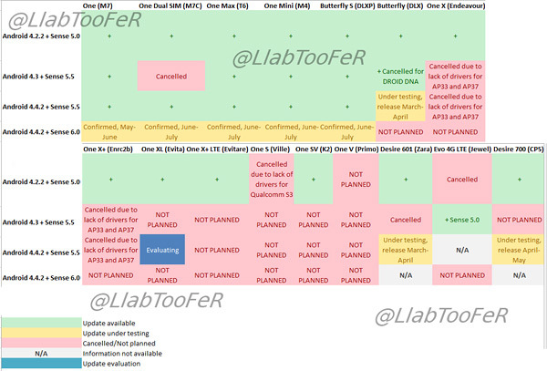 Por último, de los smartphones lanzados en 2012, ninguno será actualizado a KitKat, aunque el HTC One XL todavía estaría siendo evaluado, mientras que el Desire 601 y el Desire 700 ya están siendo probados y recibirán Android 4.4.2 KitKat y Sense 5.5 (no 6.0) entre abril y mayo, según este documento (que no ha sido confirmado por HTC).