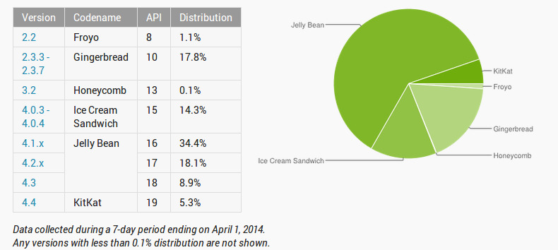Por su parte, Jelly Bean combinando todas tus versiones, se sitúa en un 61.4% del total de dispositivos, y si desglosamos por versiones, Android 4.1.x baja un 0.9%, quedándose en un 35.3. Android 4.2.x aumenta levemente hasta 18.1%, cosa normal ya que muchos fabricantes siguen apostando por lanzar sus nuevos terminales con esta versión en pleno 2014.