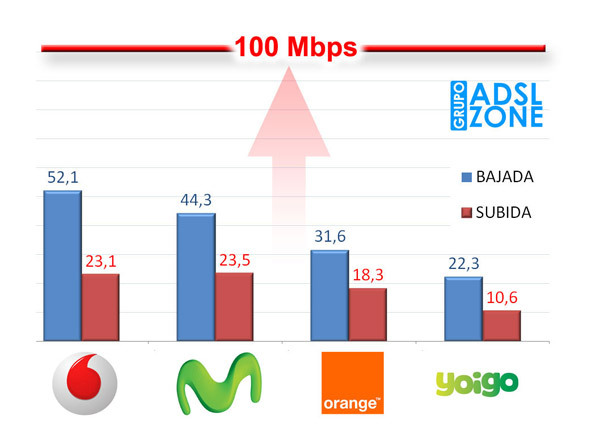 Vodafone es el operador con mejores resultados de velocidad 4G, aunque distan mucho de lo anunciado. En concreto, de media, han obtenido una bajada de 52.1 Mbps y  23.1 Mbps de subida. Por detrás está Movistar con 44.3 / 23.5 Mbps y en tercer lugar Orange con 31.6 de bajada y 18.3 de subida. Por último Yoigo, que comparte la red de Movistar, es la más lenta con una velocidad 4G de 22.3 Mbps de bajada y 10.6 Mbps de subida.