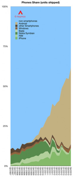 El ritmo de crecimiento de Android es espectacular y por el momento sigue sin llegar a su techo. Miles de dispositivos se activan cada día y  cuando parece que se va a estabilizar, pega otro acelerón. Además, los fabricantes se han dado cuenta del enorme potencial existente en los países emergentes, donde la mayoría de la población no tiene smartphones y están dispuestos a adquirir uno a un bajo precio.