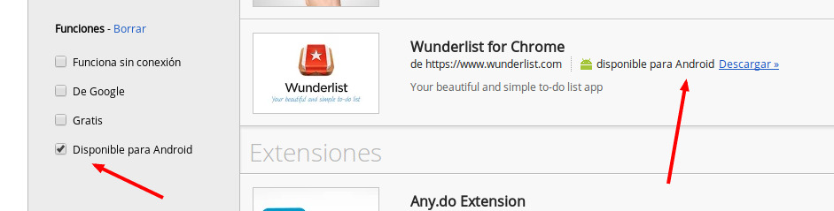 Hay extensiones de Chrome que también existen en forma de aplicación para Android, por lo que desde ahora, al realizar una búsqueda en la Web Store, podemos seleccionar la opción «Disponible para Android» para que sólo muestre resultados con esos requisitos: que el desarrollador también tenga la App en Google Play.