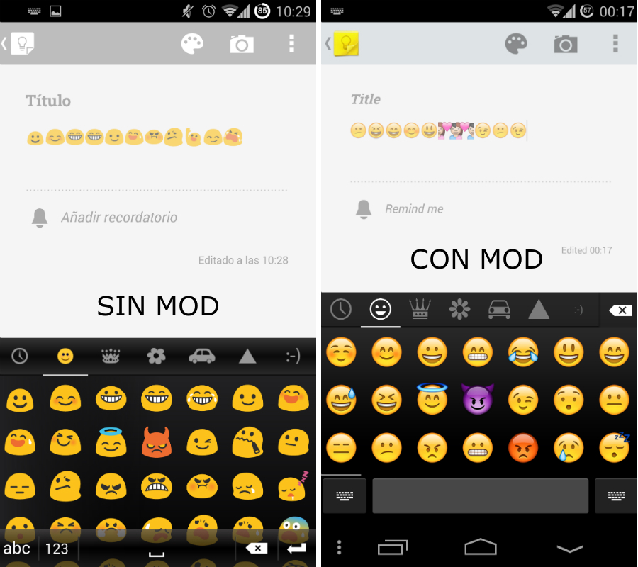 Sólo es compatible con las versiones de Android 4.4. KitKat y con el MOD instalado tendrás a tu disposición todos los emojis de nativos del iPhone en tu smartphone Android, pudiendo insertarlos en notas, navegador, contactos y en general en cualquier sitio en el que se pueda escribir texto.