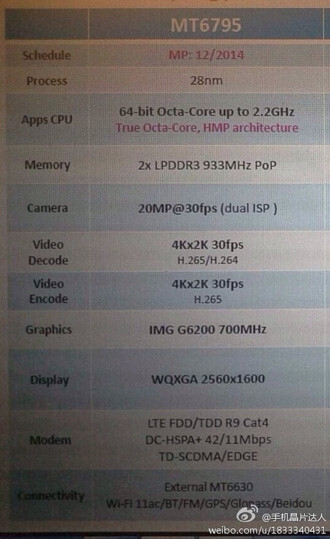 Las características las tenemos de un roadmap filtrado en el que se aprecian además las especificaciones de otros modelos. El MT6795 es una bestia parda, un SoC octa-core de 64 bits hasta 2.2GHz y dos módulos de RAM DDR3 hasta 933MHz, con soporte para cámaras de hasta 20MP, pantallas 2K, códec de vídeo H265, grabación y reproducción 4K y como no con LTE, una característica obligatoria en los tiempos que corren.