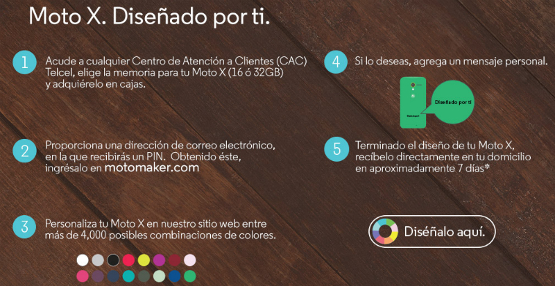 Desde hoy, los mexicanos podrán diseñar Moto X 100×100 únicos, aunque de momento el servicio estará estrechamente relacionado con la operadora Telcel. Aquellos que lo deseen, deberán ir a cualquier Centro de Atención a Clientes (CAC) de Telcel y escoger uno de los dos modelos de Moto X (en 16 o 32GB), al comprarlo, recibirán un código que deberán introducir en la web de MotoMaker.