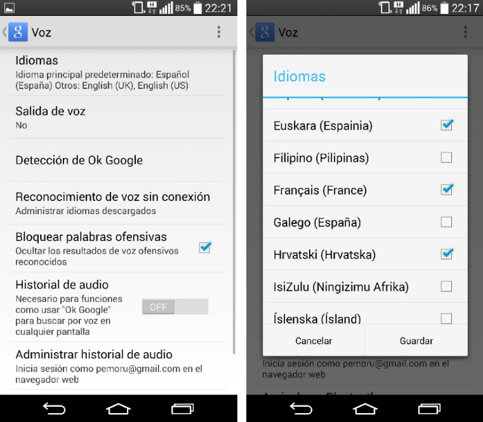 Basta con entrar a Ajustes, Voz y seleccionar los idiomas que queramos, simplemente hay que tener la versión 3.6 de Google Search, en caso contrario visita Google Play para actualizar