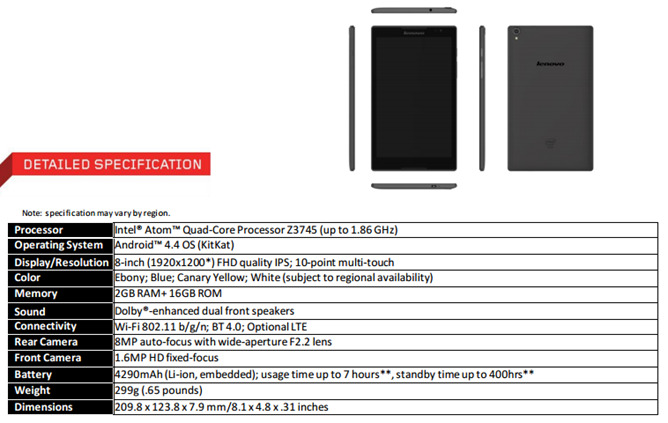 Como podéis imaginar por su nombre, la Lenovo Tab S8 dispone de una pantalla de 8 pulgadas, con un panel IPS FullHD (en concreto 1920×1200 y ratio 16:10). En su interior encontramos quizá el componente que menos guste, aunque no por ello debe dar mal rendimiento, se trata del procesador Intel Atom ZZ3745 de cuatro núcleos a 1.86GHz, acompañado por 2GB de RAM.