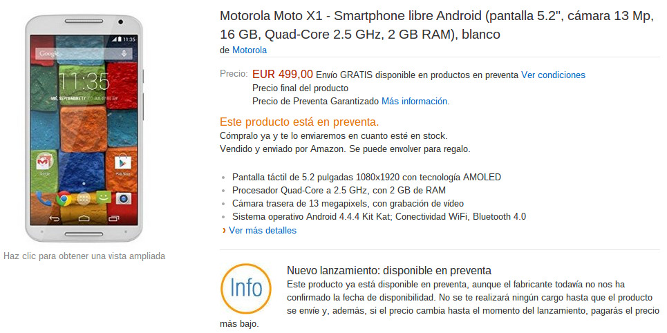Para España, Motorola ha anunciado que el Moto X llegará oficialmente el 1 de octubre a un precio de 499€ para la versión de 16GB y 579€ el de 32GB de almacenamiento. Ya sólo quedan unas semanas para ese día, pero si deseas tenerlo el primero, Amazon ya tiene en preventa este smartphone de modo que si lo compras ya, te lo enviarán justo cuando les entre stock.