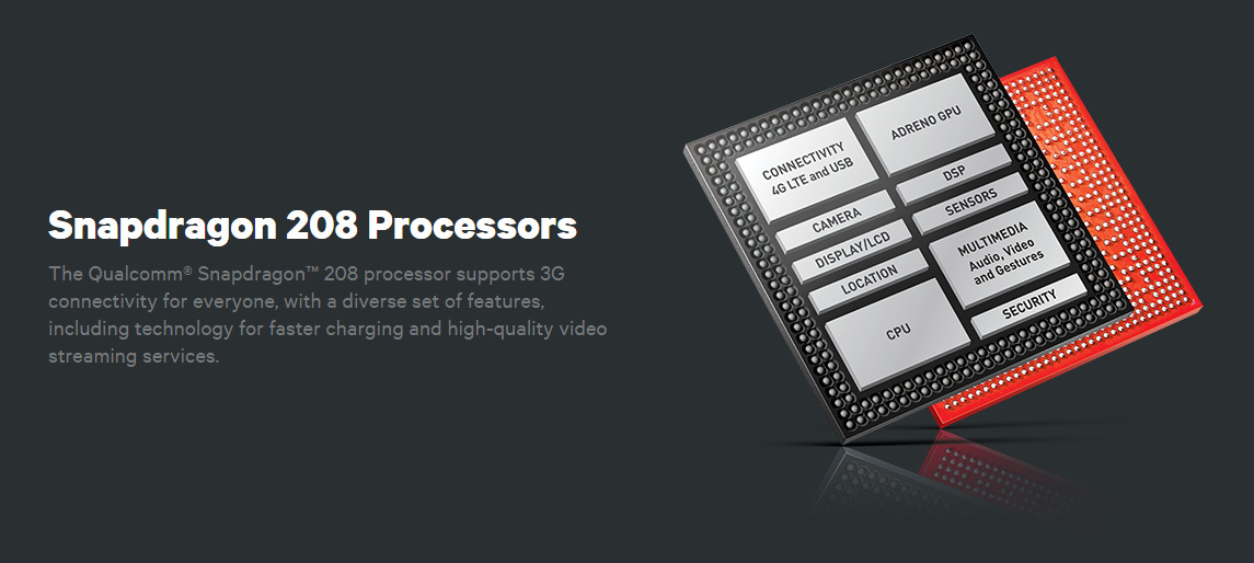 Para ser exactos, el Snapdragon 208 basa toda su potencia en procesadores ARM Cortex-A7 de doble núcleo que pueden alcanzar hasta 1.1GHz en sus mayores frecuencias, combinada con la GPU Adreno-304 que también acompaña al Snapdragon 210. Por desgracia, en este caso la máxima conectividad que tendremos en el Modem es 3G con soporte a configuraciones de doble tarjeta SIM, nada de LTE como en el Snapdragon 210.