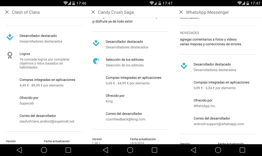 Podremos ver esta información en la misma sección en la que podemos ver detalles como el nombre del desarrollador o su correo electrónico, como podéis ver en las capturas. Grandes noticias para los usuarios, no tan buenas para todos aquellos desarrolladores que quieran «ocultar» precios de cara al público, y desde ya deberíais poder ver este apartado desde vuestro Android, en ordenador no se encuentra disponible de momento.