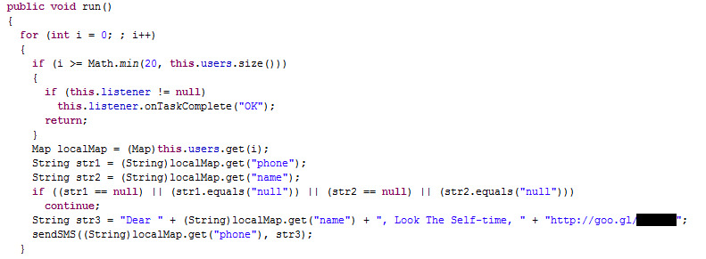La distribución en ambos casos es la misma: llega a las víctimas a través de un SMS enviado por alguno de sus contactos, refiriéndose a ellos por su nombre. Este SMS contiene un enlace acortado que lleva a una dirección web con un archivo .apk que se descarga automáticamente en el dispositivo. En el caso de que se haya instalado con éxito, automáticamente la aplicación empezará a hacer su trabajo, y aquí es donde empezamos a ver las diferencias: