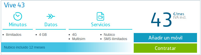 Comenzamos por Movistar, que tiene entre sus productos la tarifa móvil Vive 43 que incluye 4GB de datos, minutos ilimitados, SMS ilimitados, conectividad 4G y MultiSIM por 43€ al mes (IVA incluido), haciendo honor a su nombre.