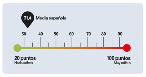Además, los españoles pasamos de media 33 horas a la semana usando el móvil y entre la población española, los más enganchados son las mujeres y los más jóvenes. Según un índice establecido por la OCU, del 20 al 100 de adicción, donde 100 es muy adicto, los españoles tenemos un índice del 31.4.