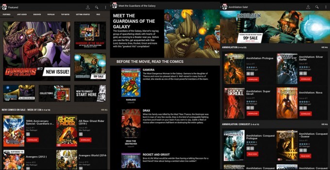 La aplicación de Marvel es en realidad una adaptación de ComiXology, una aplicación que cuenta con el catálogo, no sólo de Marvel sino también de DC, Dark Horse o de Image Comics (The Walking Dead), pero por contra no ofrece las opciones para encontrar nuevos cómics con la facilidad de la aplicación de Marvel.