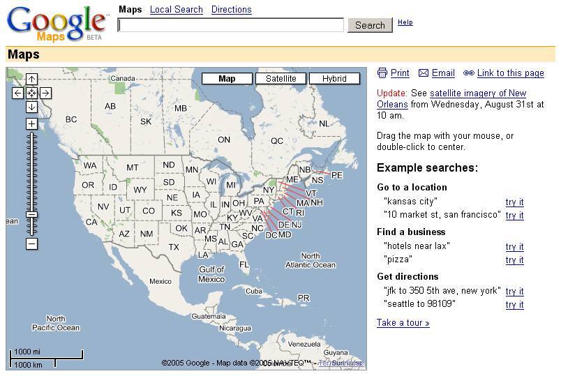 El 8 de febrero de 2005 fue cuando se presentó oficial Google Maps en el blog oficial de la compañía. Se trataba de la versión inicial en versión web y que estuvo en fase beta durante meses hasta que finalmente se integró formando parte de Google Local. Como podéis ver en las imágenes, lejos queda aquella interfaz de la actual.