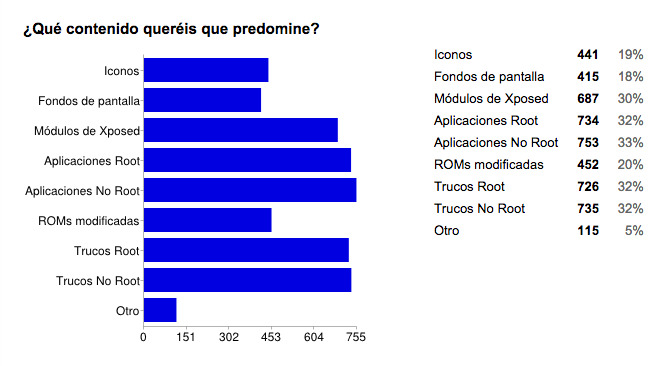 Aquí podréis ver de manera rápida el número de votos que ha recibido cada sección. Vemos que lo que más queréis son tanto Aplicaciones root y no root, además de trucos root y sin necesidad de root. Los módulos para Xposed tienen también un buen pico de votos y el resto, aunque hayan recibido pocos, intentaremos meterlo aunque no semanalmente.
