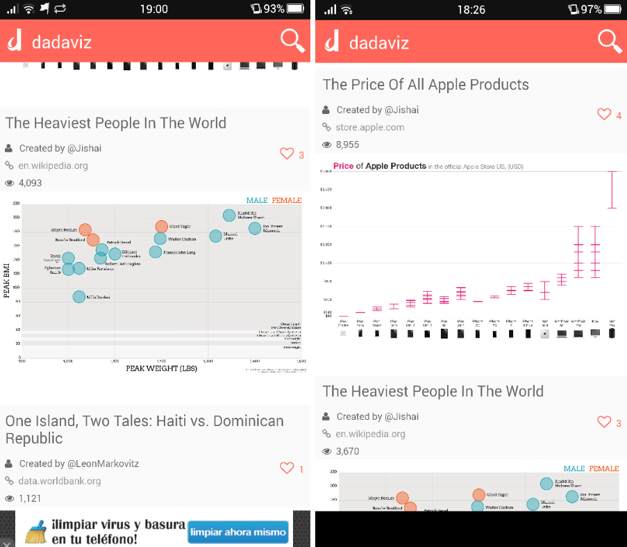 Dadaviz recopila datos y estadísticas en forma de gráficos y tablas visuales. Comparte información relevante en imágenes directas.