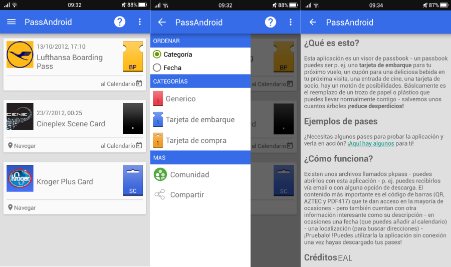 Desde entonces y tras algunas actualizaciones, PassAndroid PassBook ha mejorado ese aspecto y ahora disfruta de un sencillo pero atractivo diseño Material Design. El funcionamiento de la utilidad no tiene misterio, basta con recibir el archivo PKPASS o descargarlo desde el navegador, email, etc. y podremos abrirlo directamente con PassAndroid, añadiéndose así a la lista.