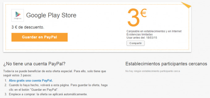 Consigue cupones de 3€ para gastar en Google Play con PayPal. Aprovecha y compra juegos y aplicaciones de todo tipo, es gratis!