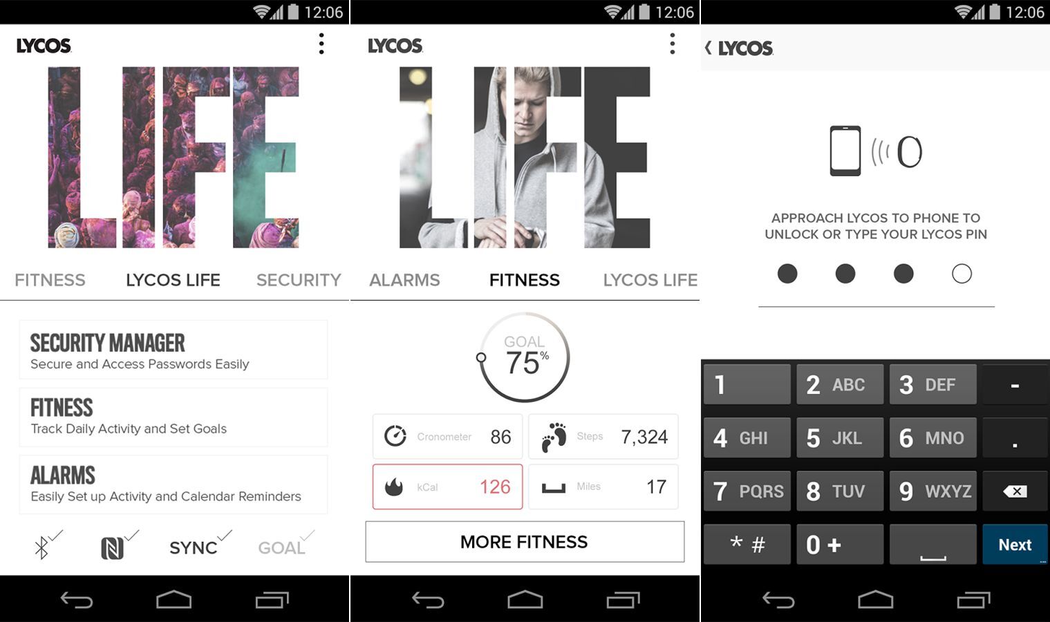 Podéis ver la lista completa de funciones en su página web, pero si es cierto que son ambiciosas: seguridad móvil, tocar para transferir archivos de forma inalámbrica, monitor de fitness, resistencia al agua, Bluetooth 4.0, y entre 12 y 14 días de batería. Todo ello gracias a la aplicación de Lycos Life para Android que se sincroniza con estos wearables, y que ya se puede descargar en Google Play bajo la etiqueta de versión beta.