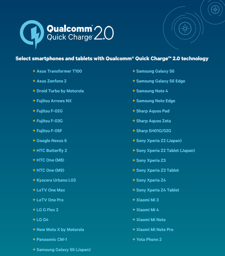 A continuación os dejamos con una lista completa de los terminales en el mercado que están dotados de la tecnología Quick Charge 2.0 de Qualcomm.