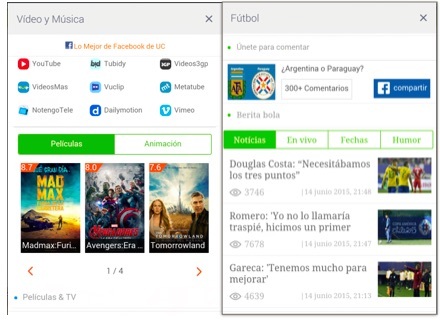 UC Browser permite consultar, a través de una serie de accesos directos, contenido adaptado a tu idioma y tu localización. Así de esta manera podrás echar un rápido vistazo a películas, series de televisión, noticias o vídeoclips así como contenido deportivo. Y es que si eres un fanático del fútbol, UC Browser acaba de habilitar una sección dedicada a la Copa América, desde donde podrás consultar el resultado en tiempo real hasta ver vídeos destacados con comentarios y momentos clave de los partidos.