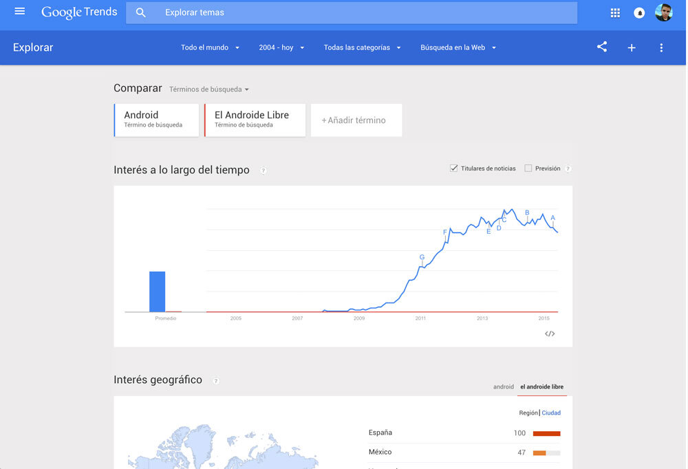 El gran cambio en Google Trends, aparte del rediseño que podéis ver en las capturas en un agradable Material, es que los datos ahora nos llegan en tiempo real: podemos examinar los millones de búsquedas que se hacen en Google sin esperas, tal y como están sucediendo por todo el mundo. Parecerá algo trivial teniendo el historial disponible para bucear en el pasado cercano, pero esto nos permite encontrar qué es lo que más interesa a los internautas ahora mismo, y qué aspectos de un evento a nivel nacional son los que más expectación están levantando, por ejemplo.
