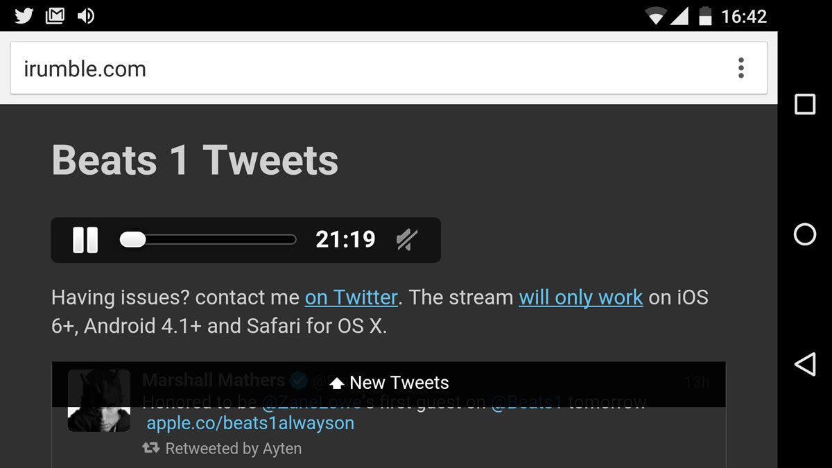 Si estáis desde vuestro Android con Jelly Bean 4.1 o superior (aunque también funciona en iOS 6 o superior, y en Safari para OS X), The Verge nos trae la solución: una página web no oficial que nos permite escuchar Beats 1 en riguroso directo. Sólo necesitamos entrar en esta página web con uno de esos dispositivos compatibles y listo, podremos escuchar sin más problemas.