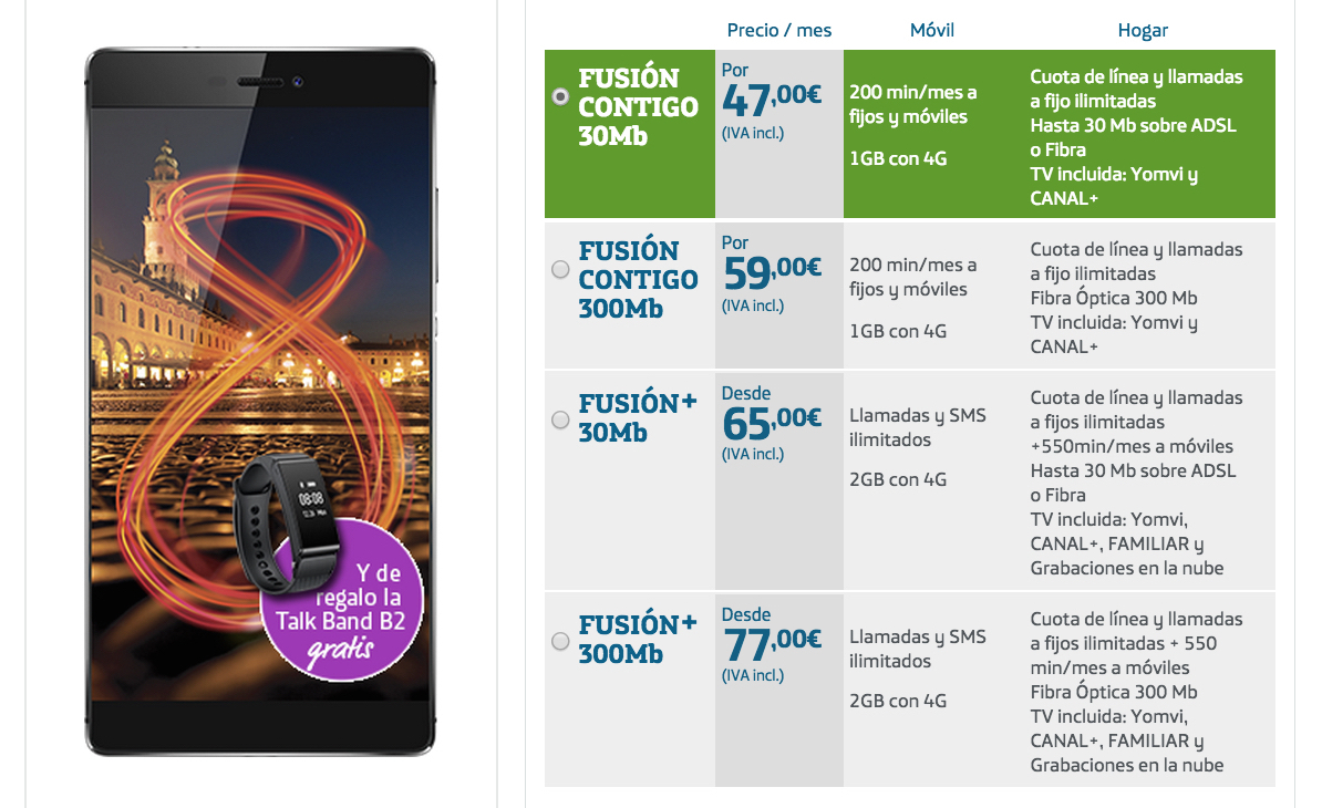 Disfruta de los los mejores contenidos de Movistar+ con Yomvi con el Huawei P8. Fusión contigo nos ofrece 200 minutos al mes gratis + 1GB de conexión 4G. Además tendremos llamadas ilimitadas a fijos, fibra óptica de 30Mb o 300Mb y las mejores series, cine y documentales con Yomvi y Canal+.