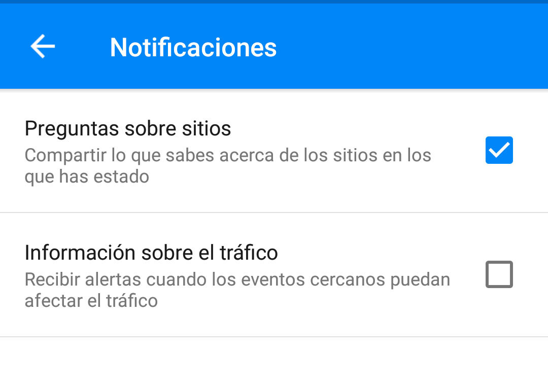 Para desactivarlas basta con ir hasta ajustes y bajar hasta la pestaña de notificaciones. Allí, junto a «preguntas sobre sitios» encontrarán «información sobre el tráfico», que por defecto vendrá activada. Al desmarcar la casilla dejarás de recibir estas notificicaciones.