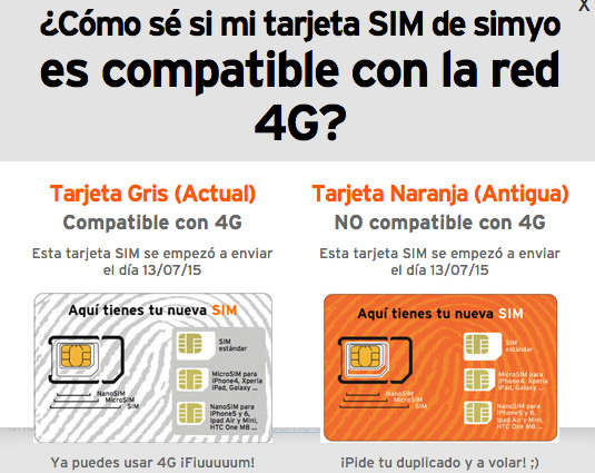 Si tu tarjeta es anterior, la de color naranja, deberás solicitar un duplicado, algo que puedes hacer desde tu área personal, y en unos días recibirás tu nueva SIM compatible con 4G. Hasta el 15 de enero de 2016 el duplicado de la tarjeta será gratuito para los clientes de Simyo.