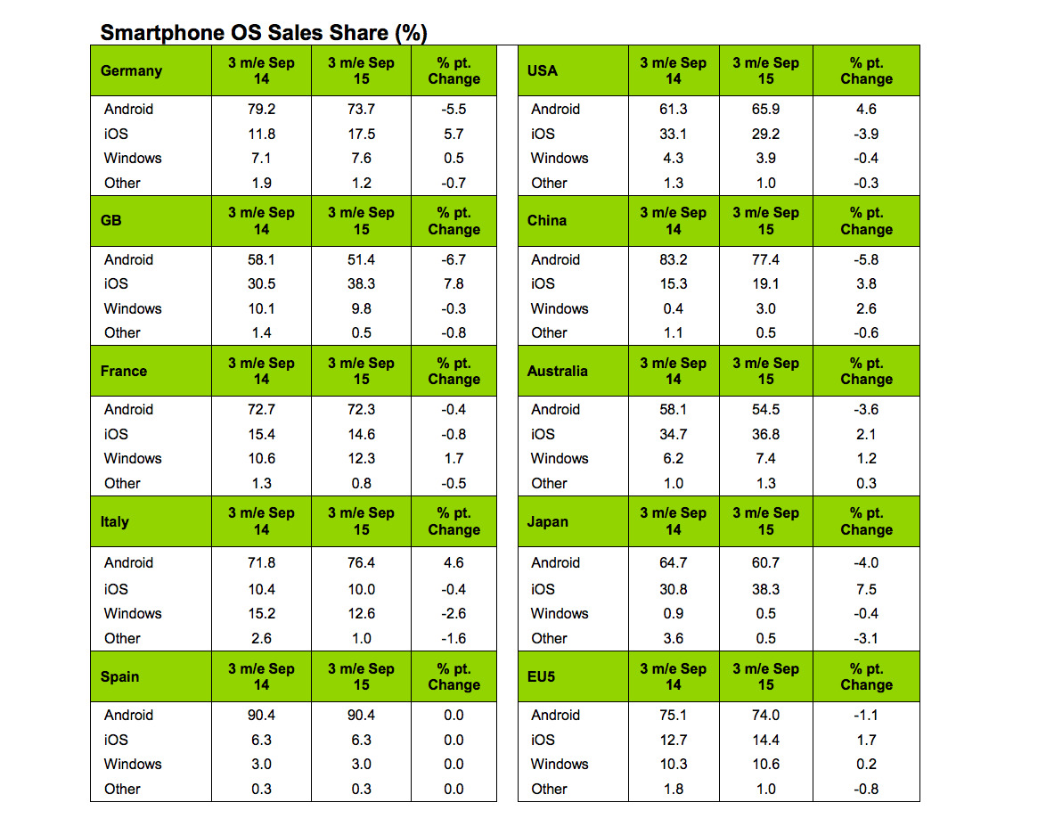 Aquí tenéis la gráfica con los datos mundiales por sistema operativo. Tenemos datos muy variables, mientras Android sube su cuota de mercado en Italia o los Estados Unidos, baja en el resto de países. Muy interesantes los datos de España, un mercado que se mantiene exactamente como el año pasado (con una clara dominación por parte de Android).