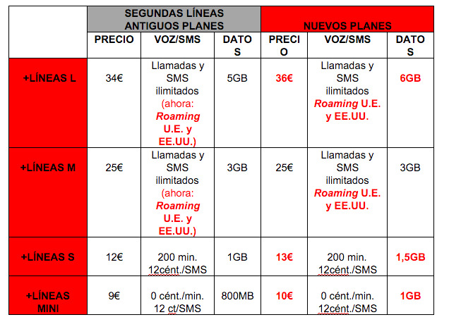 Además Vodafone también mejora la oferta de segundas líneas –dirigidas a las familias–, no sólo incorporando el roaming de forma gratuita en +líneas M y L (llamadas y SMS ilimitados) sino también incrementando el volumen de datos mensual. Este volumen aumenta entre 200 MB y 1GB y los precios se ajustan entre 1 y 2 €/mes.
