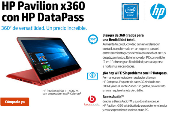 Si estás buscando algo que realmente sea distinto y útil, una buena inversión, en PcComponentes tienen el HP Pavilion x360 con HP DataPass por 379€. ¿Qué te quedas sin WIFI? Con el paquete DataPass tendrás acceso a internet igualmente.