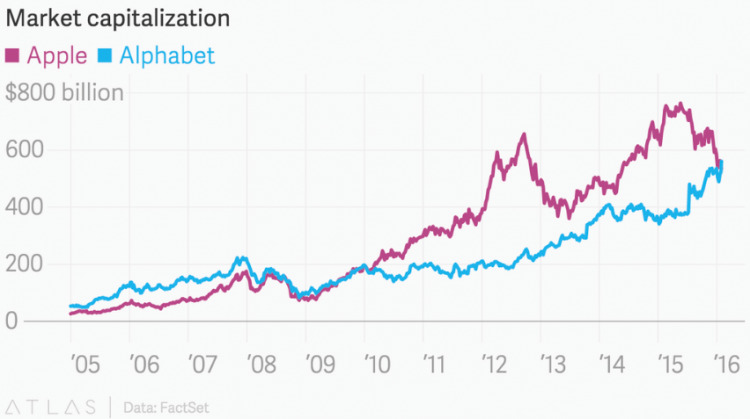 La empresa fundada por Jobs ha perdido en los últimos doce meses el 18% de su valor. Un dato que contrasta con el fulgurante ascenso de Alphabet, que ha crecido un 40% desde enero de 2014.