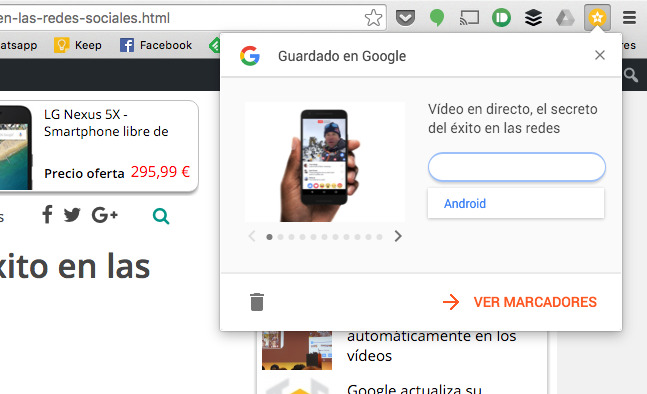 Se trata de una extensión de Google Chrome que nos permitirá, con un sólo click, guardar todos los enlaces que queramos para acceder más tarde. Para guardarla, sólo hay que presionar sobre el icono de la extensión que se sitúa a la derecha de la barra de direcciones. En la ventana que aparecerá, podemos añadir una etiqueta y cambiar la imagen de portada.