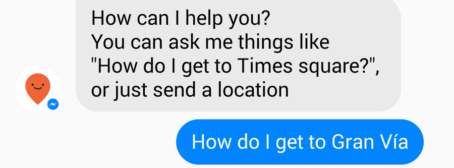 Por ejemplo, si escribimos el mensaje de «How do I get to Gran Vía?» en el chat, el bot nos preguntará el lugar desde el que queremos iniciar nuestra ruta. Podemos indicar el lugar de origen tanto escribiendo una ciudad (o una dirección) como permitiendo que el bot pueda acceder a la localización exacta en la que nos encontramos en ese momento.