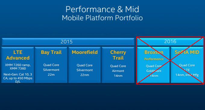 Intel está acelerando su transformación de una compañía de PCs a otra que de vida a la nube y a los millones de dispositivos inteligentes conectados entre ellos. […] Puedo confirmar que los cambios de esta reestructuración incluyen la cancelación de la plataforma Broxton, así como también la de la plataforma SoFIA 3GX, SoFIA LTE y SoFIA LTE2.