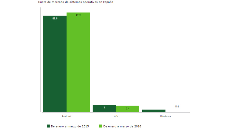 Comenzando por España, las estadísticas revelan que la presencia de este sistema operativo se ha disparado hasta el 92,9%, varios puntos por encima del 89,9% que se alcanzó durante el mismo periodo del año pasado (un porcentaje que, por cierto, recordemos que el año pasado también mejoró el 89% alcanzado dos años atrás). iOS ha caído desde el 7 hasta el 6,4%, y lo que queda de Windows Phone se reduce hasta el 0,6% de presencia en el mercado (frente al 2,8% que ocupaba el año pasado).