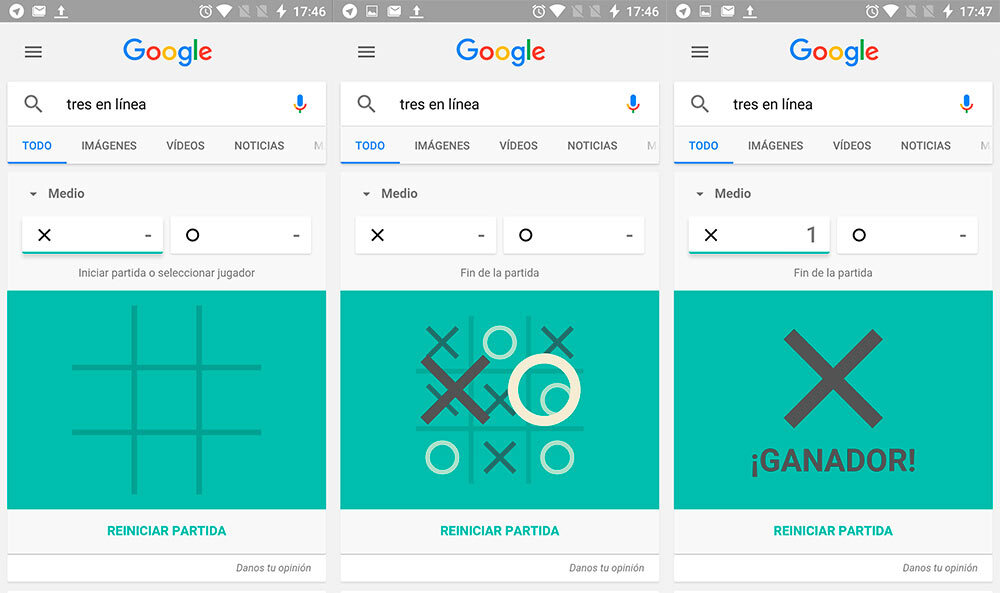 Para jugar al tres en raya y al solitario necesitas escribir las palabras en la barra de búsqueda de Android. No funciona ni en el navegador móvil ni en un navegador de escritorio, al menos de momento Ya funciona. No es más que una curiosidad, pero puede solucionar una tarde aburrida en el caso de que no tengas otro juego a mano.